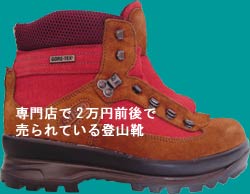 この低価格な靴は、アップダウンの無い林道や、木道などを歩くには良い靴ですが、登山道や岩場がある縦走路を歩くには、役不足。時として危険を伴うスポーツですから、万全の装備で歩きたいものです。 北アルプスなど、岩場の危険が多い稜線で、このタイプの靴を履いて歩いている方(特に初心者の方に多い)を見かけます。 『たかが山登り、靴なんてこんなもんでいいや』という感じで購入されたのだと思います。山登りを安全に永く続けたい方は、装備選びには正しい知識をもって選ぶ必要があります。まだ初心者でご自身では判断ができない場合は、ベテランの先輩か、信頼のある登山の専門店に相談してください。 靴の構造や、材質は見た目にはわかりにくいものですが、登山靴を購入される場合は、『登山靴』と『登山靴風』があることをご注意下さい。 かなしいかな専門店でも最近『売れるから』?という理由で低価格の靴を置いているお店があります。旧モデルなど値引きしている物は別として、低価格な靴には、必ず安い理由があります。その靴を使うことにより『関節を痛めたり』『滑って転んで怪我をした』のではかえって高くつきます。何よりも歩きづらいと山登りが楽しくありません。 登山靴は、最低でも2万円以上の登山靴をおすすめします。 | |